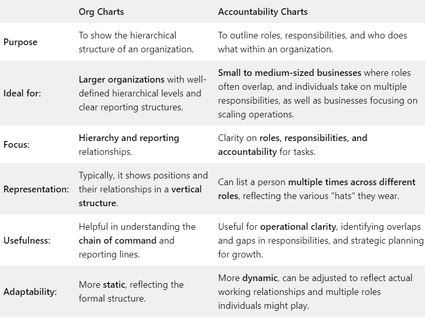 Here's a brief comparison between the org and accountability charts to clarify any lingering confusion.