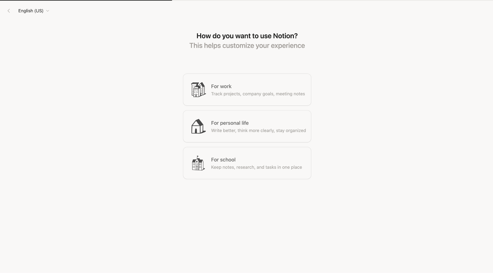 Notion only asks how you want to use Notion. No other personalization questions.