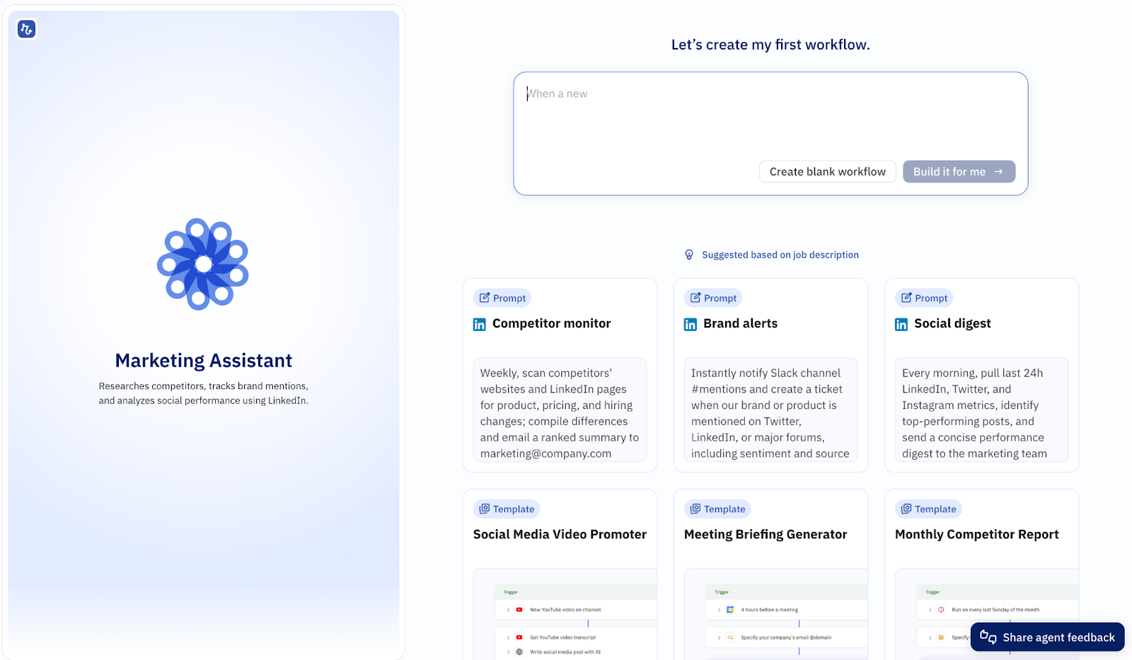 Once you move on to building your agents and pick a topic (i.e. Marketing), the app will make precise AI workflow suggestions based on your onboarding context and profile.