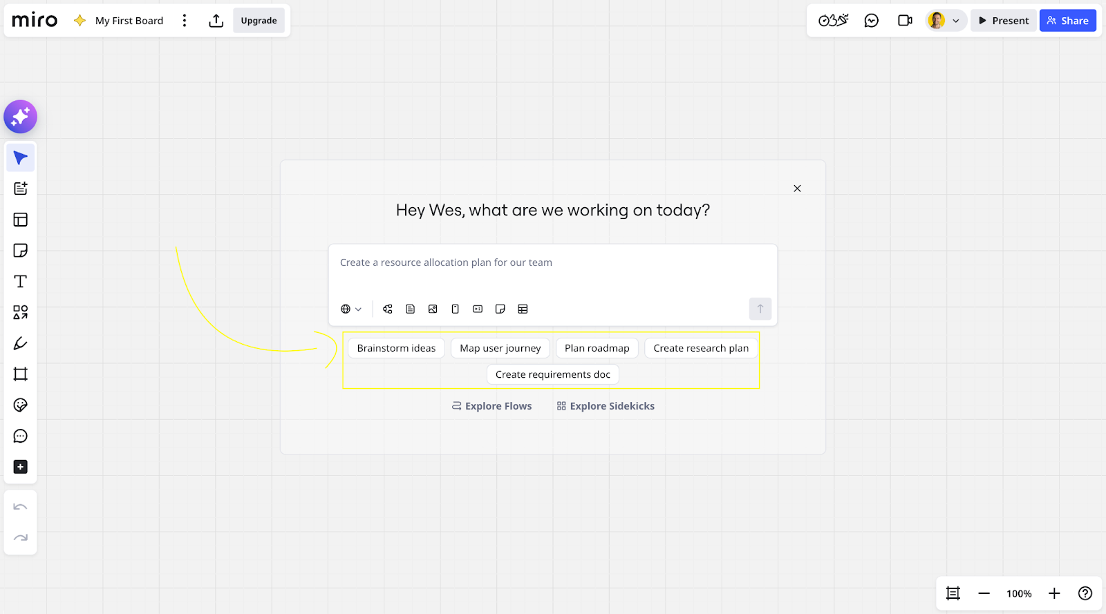 In Miro, on the other hand, the entire first experience with your workspace is an AI chatbot.