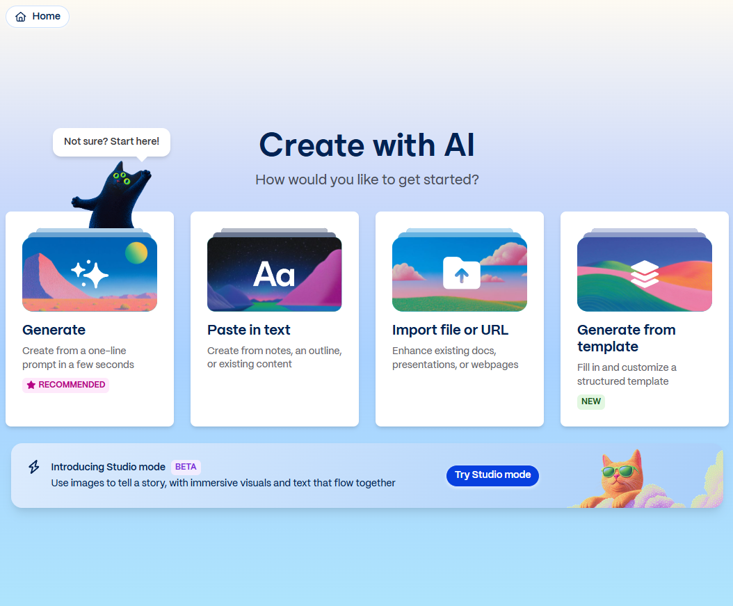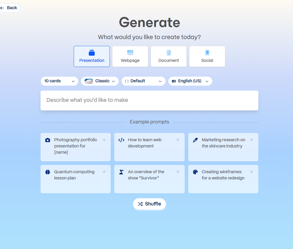 Once I select the recommended option I do get to the generate page where I can share my prompt and get a basic presentation generated.