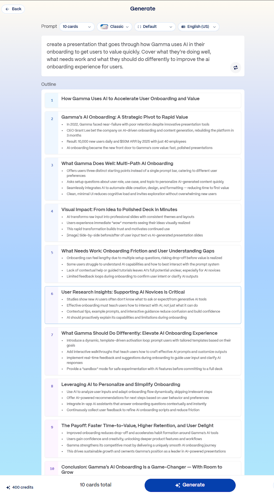 Within seconds, Gamma gives me a 10-card presentation overview that is pretty good.