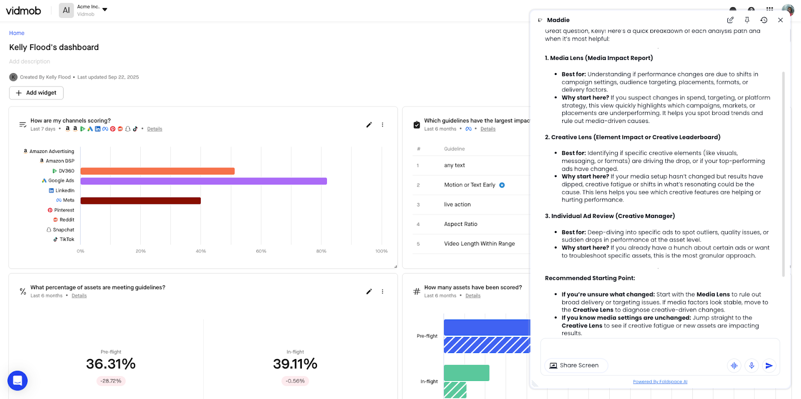 For more complex products, feature adoption may vary by role. Vidmob’s agent can analyze what you’re seeing on screen, and make recommendations based on your progress and assumed desired outcomes. View image below 👇