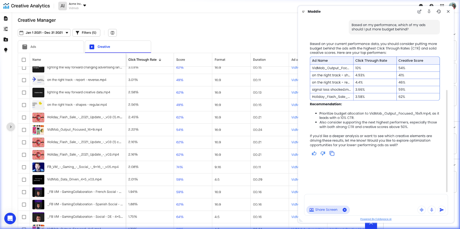 Examples: Vidmob’s AI agent will give tailored recommendations, and perform actions based on user roles and desired outcomes (enabled by Foldspace.ai)