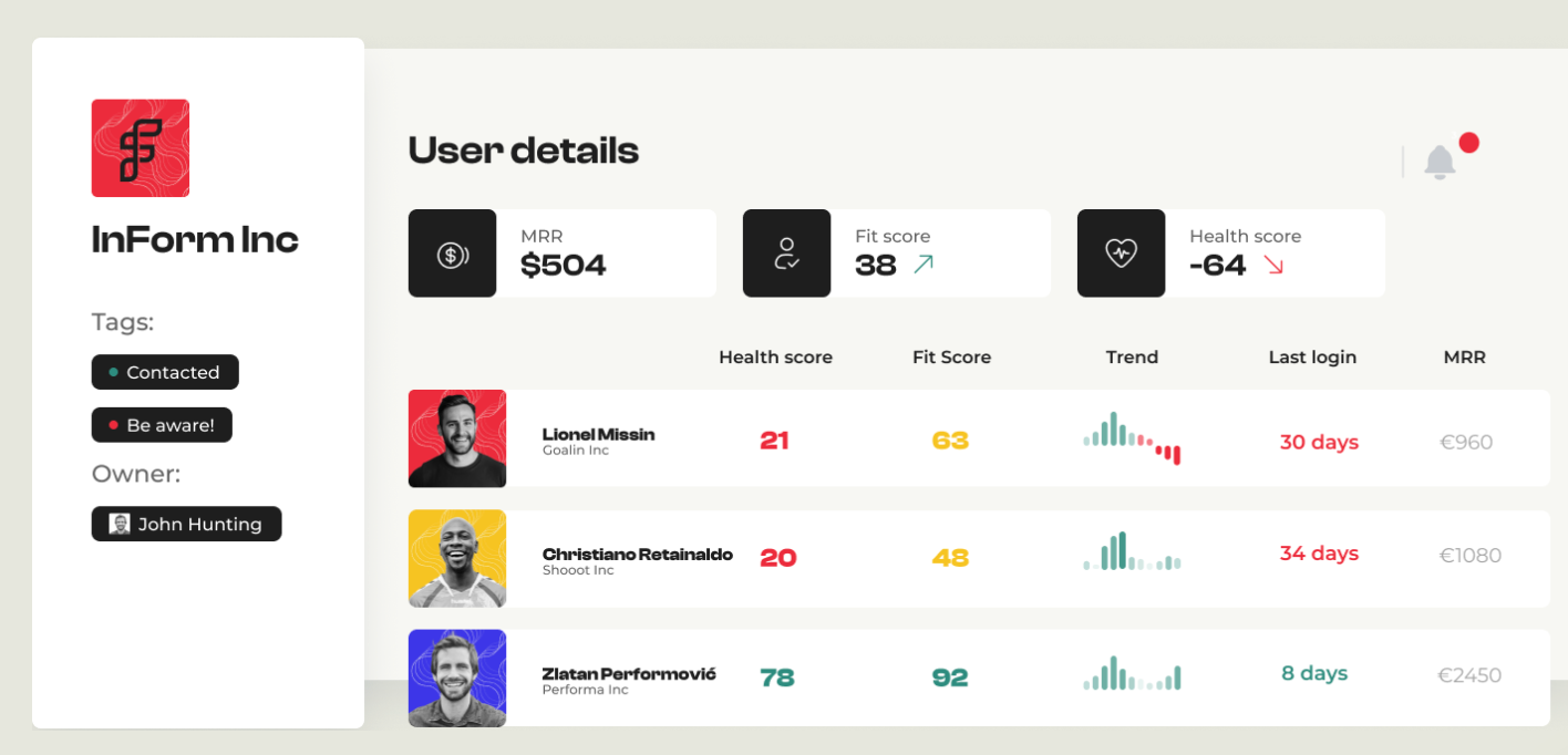 We do not have a concrete example for this one. However, platforms like customerscore.io can flag churn risks based on product usage. That data can be fed to the AI agent in your UI as extra context, to help it tailor experiences and avoid user churn.