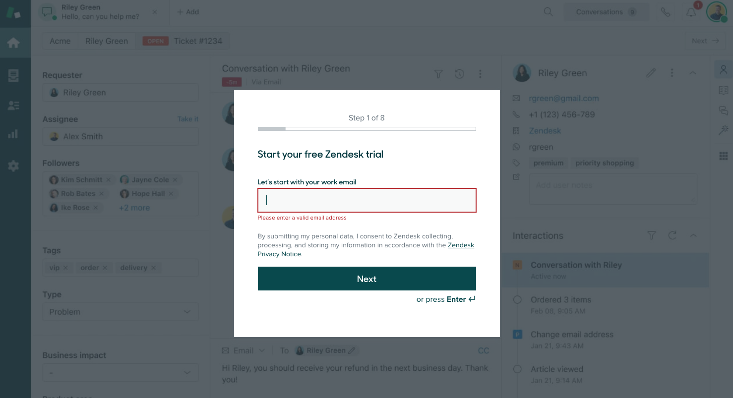 One example is Zendesk. When you click "Free Trial" on their homepage, you are led through an eight-step process to initiate a 30-day trial subscription for their Plus plan.