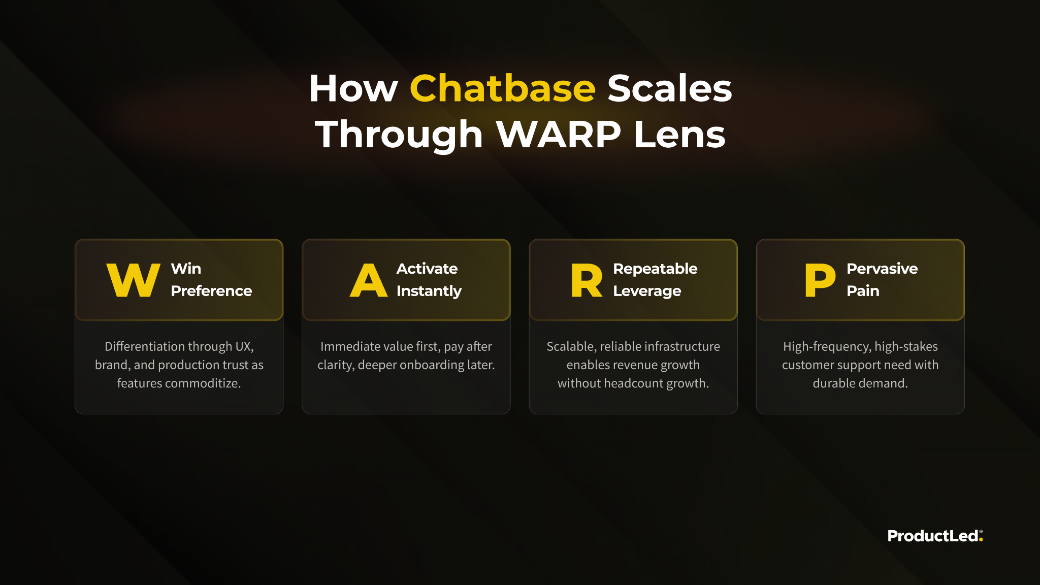 A useful way to summarize why Chatbase could scale with such a lean team is the WARP Framework: Pervasive Pain, Win Preference, Activate Instantly, and Repeatable Leverage. These four forces help explain why some products can grow fast without scaling headcount at the same rate.