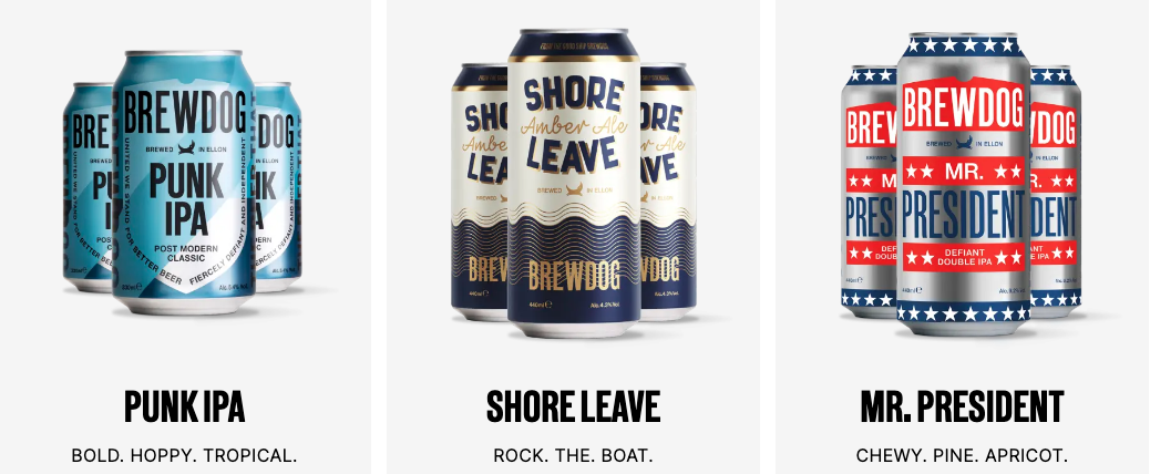 BrewDog shows its distinct brand voice in its product copy, with phrases like "Punk IPA, Bold. Hoppy. Tropica," "Shore Leave, Rock. The. Boat," and "Mr. President, Chewy. Pine. Apricot"
