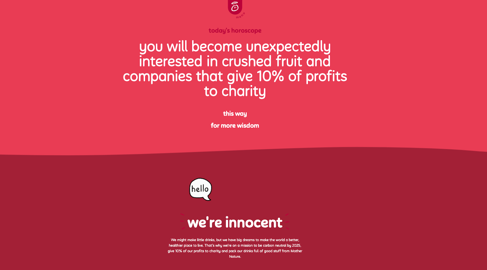 Innocent is a healthy drink brand with a fun and fresh approach. The company’s dedication to social and eco-friendly practices is present right off the bat on their homepage horoscope reading: “You will become unexpectedly interested in crushed fruit and companies that give 10% of profits to charity.”