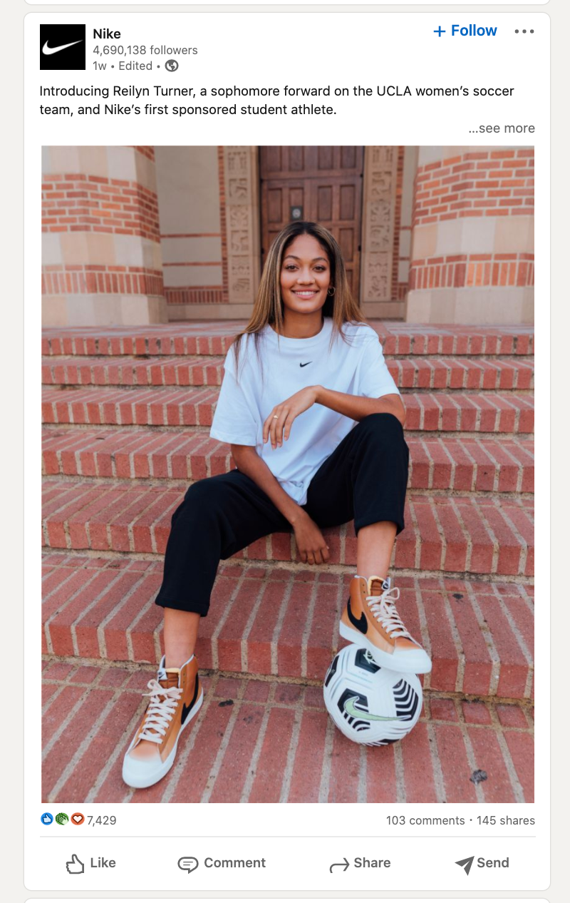 Nike still talks about leadership and motivation on LinkedIn, but they do it through internal company stories instead of athletics. At the same time, they keep a tone that motivates others.