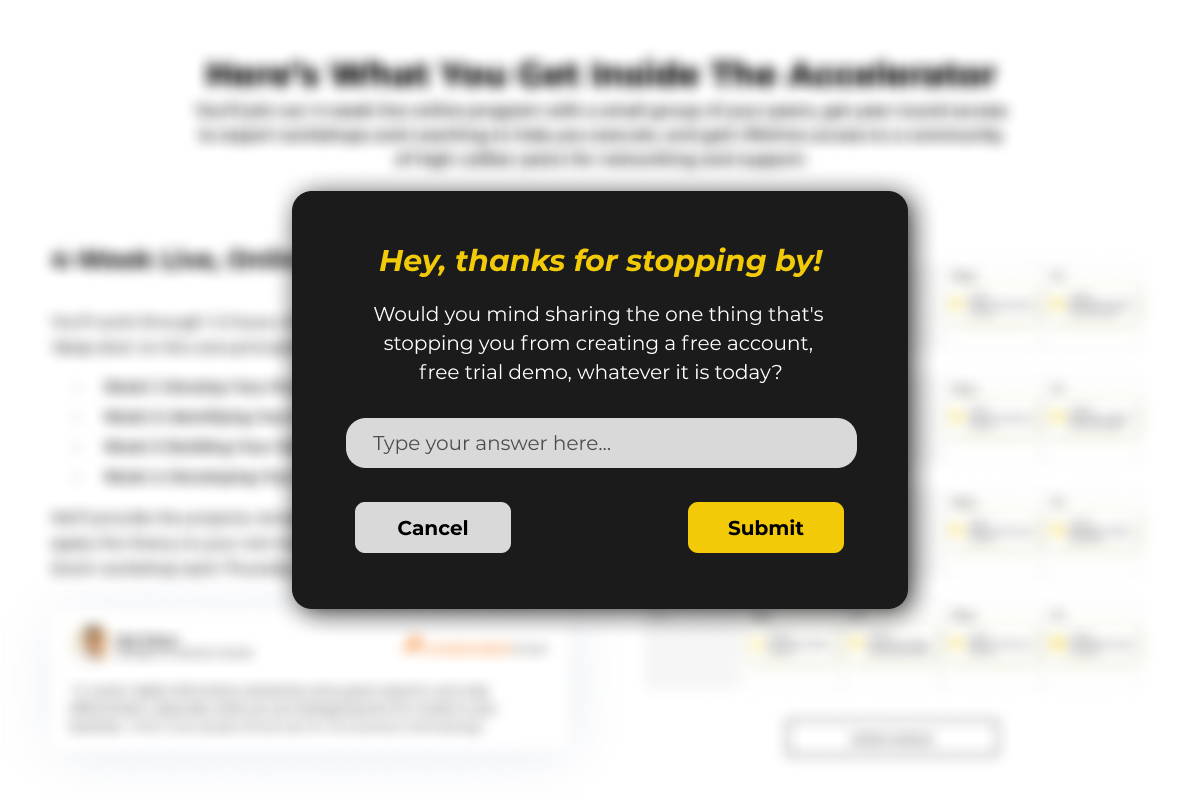 - Running Surveys: For a website, an easy thing to do is to create a pop-up survey saying: “Hey, thanks for stopping by! Would you mind sharing the one thing that's stopping you from creating a free account, free trial demo, whatever it is today?”