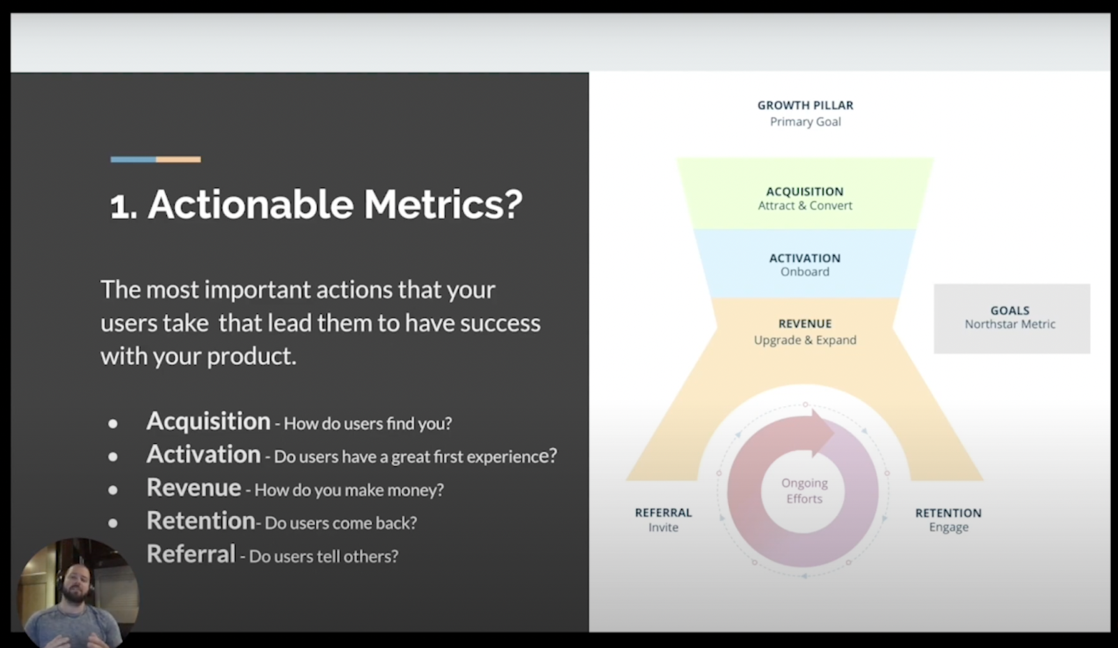 Acquisition, Activation, and Revenue make up the funnel, whereas Retention and Referral are ongoing efforts.