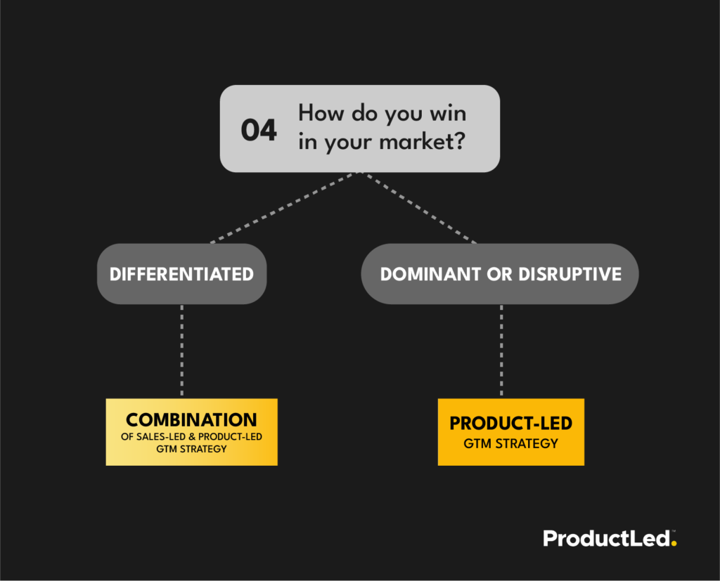 The final factor in determining if a sales-led GTM strategy is right for you is your business strategy for beating the competition and growing your customer base. In competitive markets, there are three main categories: