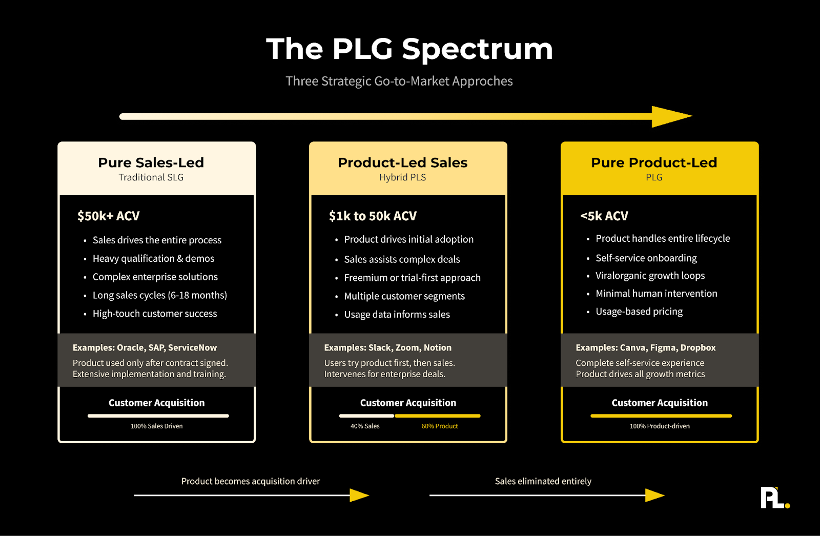 The most dangerous misconception about PLG is treating it as an either/or decision. Product-Led Growth exists on a spectrum, and the most successful companies find their optimal position based on product complexity, deal size, and customer segments.