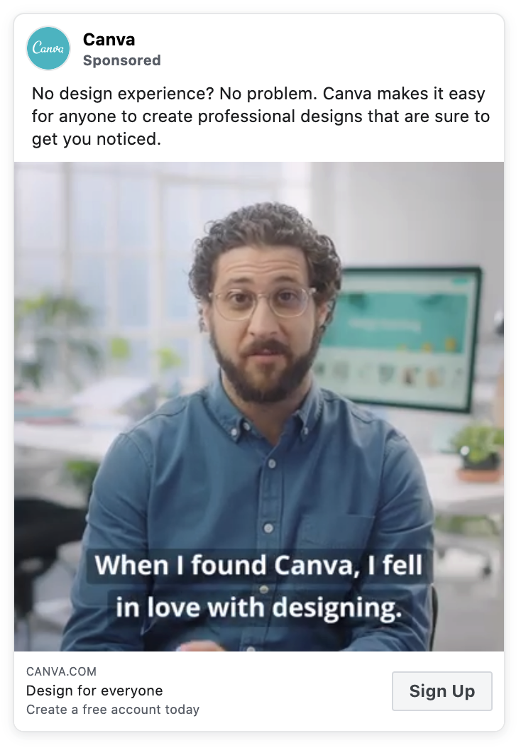 Take, for instance, one of Canva’s social ads, which reads, “No design experience? No problem. Canva makes it easy for anyone to create professional designs that are sure to get you noticed.”