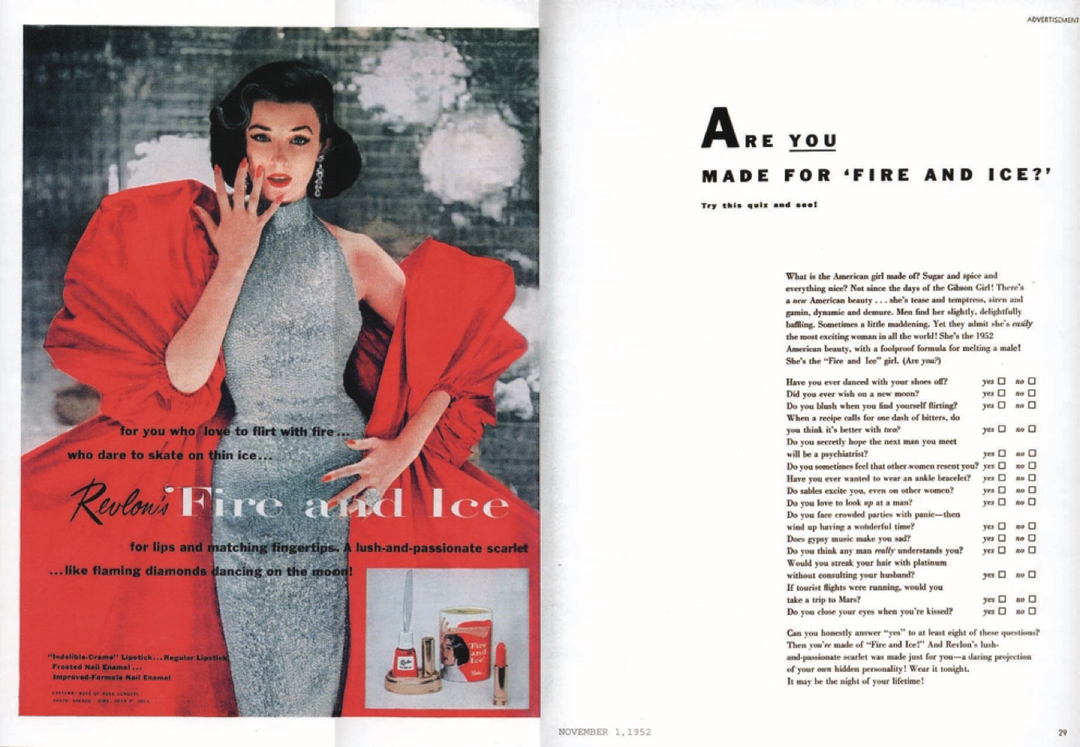 You can see this idea front-and-center in one of Revlon’s breakout magazine advertising campaigns from 1952, Fire and Ice. The brilliant ad campaign makes it clear that Revlon isn’t selling lipstick or nail polish; it’s selling a “better you.”