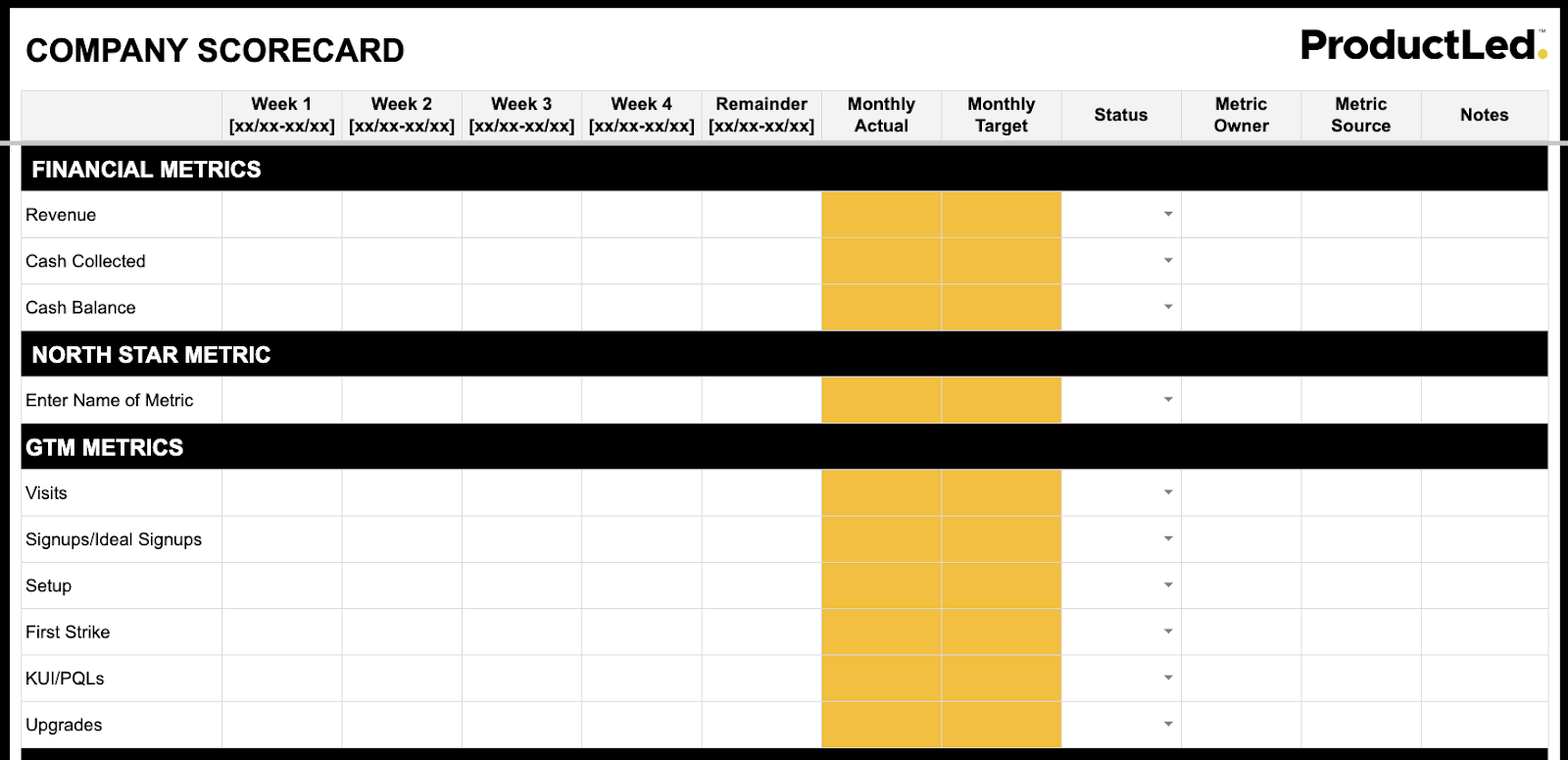 Because the scorecard metrics for a product-led company are unique; they focus on how value is delivered to users. Your team should track these ten key metrics: