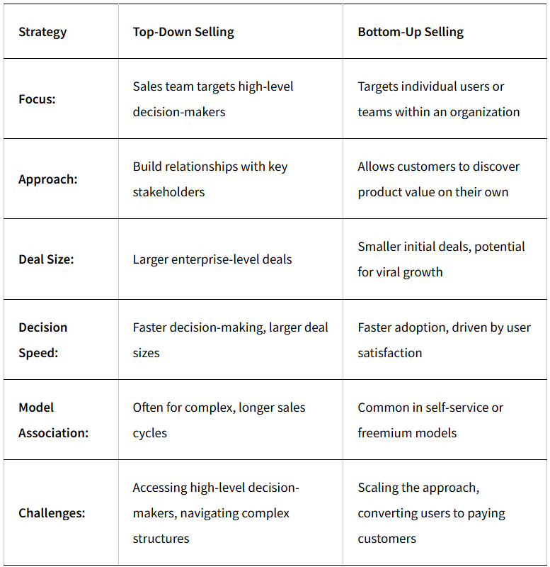 Unlike bottom-up selling, which is more prevalent in the consumer market, top-down selling involves longer sales cycles and requires a deeper understanding of the product.