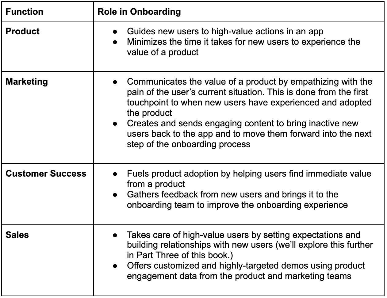 The key is that whoever owns user onboarding needs to ensure it’s a cross-functional effort, where each person only has a small, fractured view of the bigger picture.