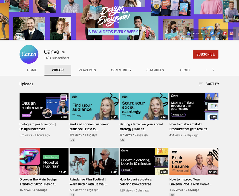 Canva uses its YouTube channel to educate users with new how-to videos every week, keeping them engaged with their product and coming back for more.