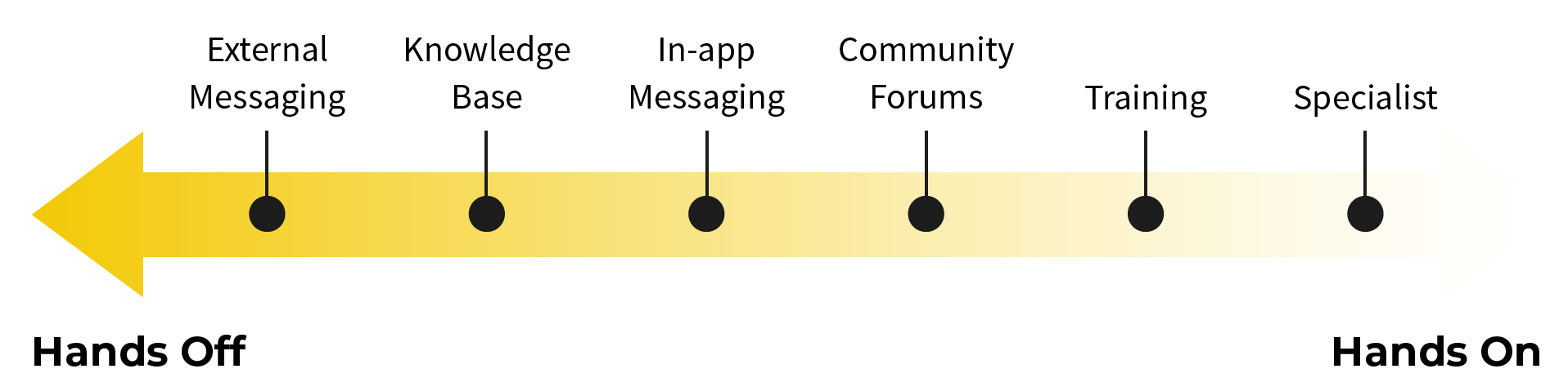 Specialists: Technical support specialists make it easier for users to hit the First Strike. Sales specialists help users make a business case for purchasing a solution. Specialists are by far the most hands-on you can be for users, but they can speed up the time your users get to value and upgrade. They also happen to be one of the easiest to start rolling out.