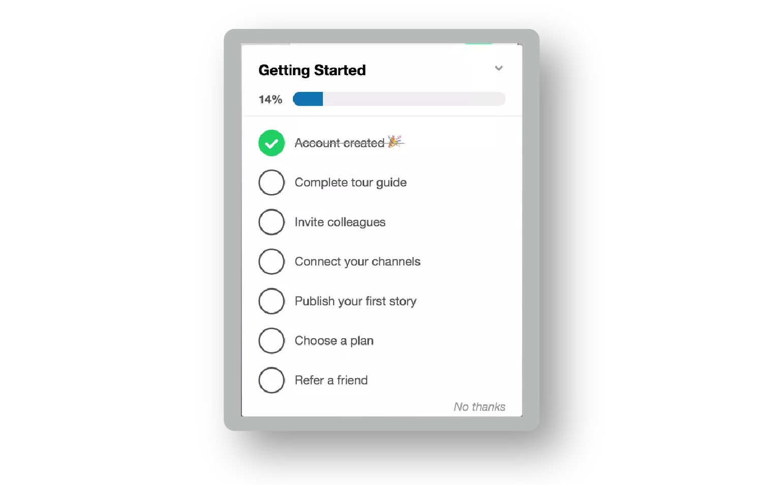 Checklists: Checklists break down big tasks into bite-sized ones. In addition to giving users an overview of how to set up their accounts, checklists simultaneously increase user motivation because users know how many steps it takes. Maximize their value by partially filling them out before the user sees them.