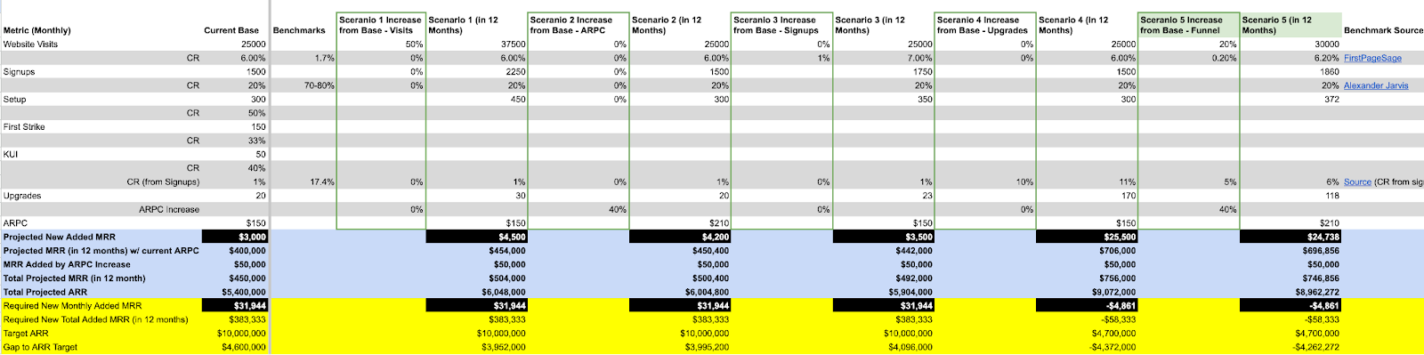 Once we mapped the funnel end to end, we modeled a handful of realistic growth scenarios over 12 months, including: