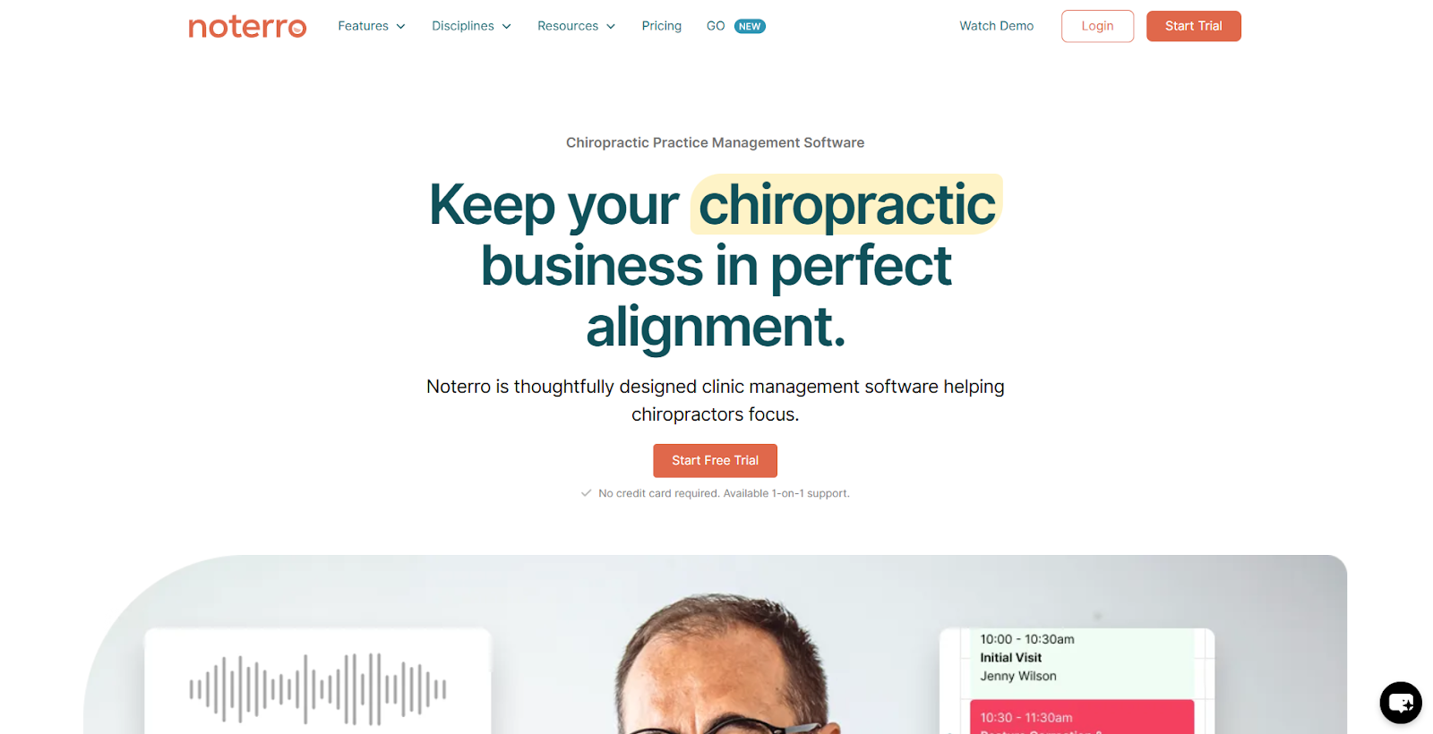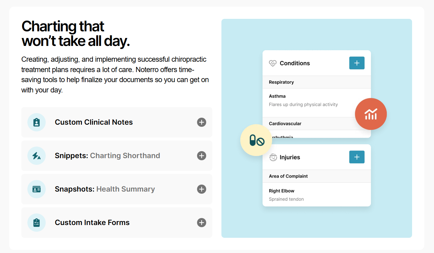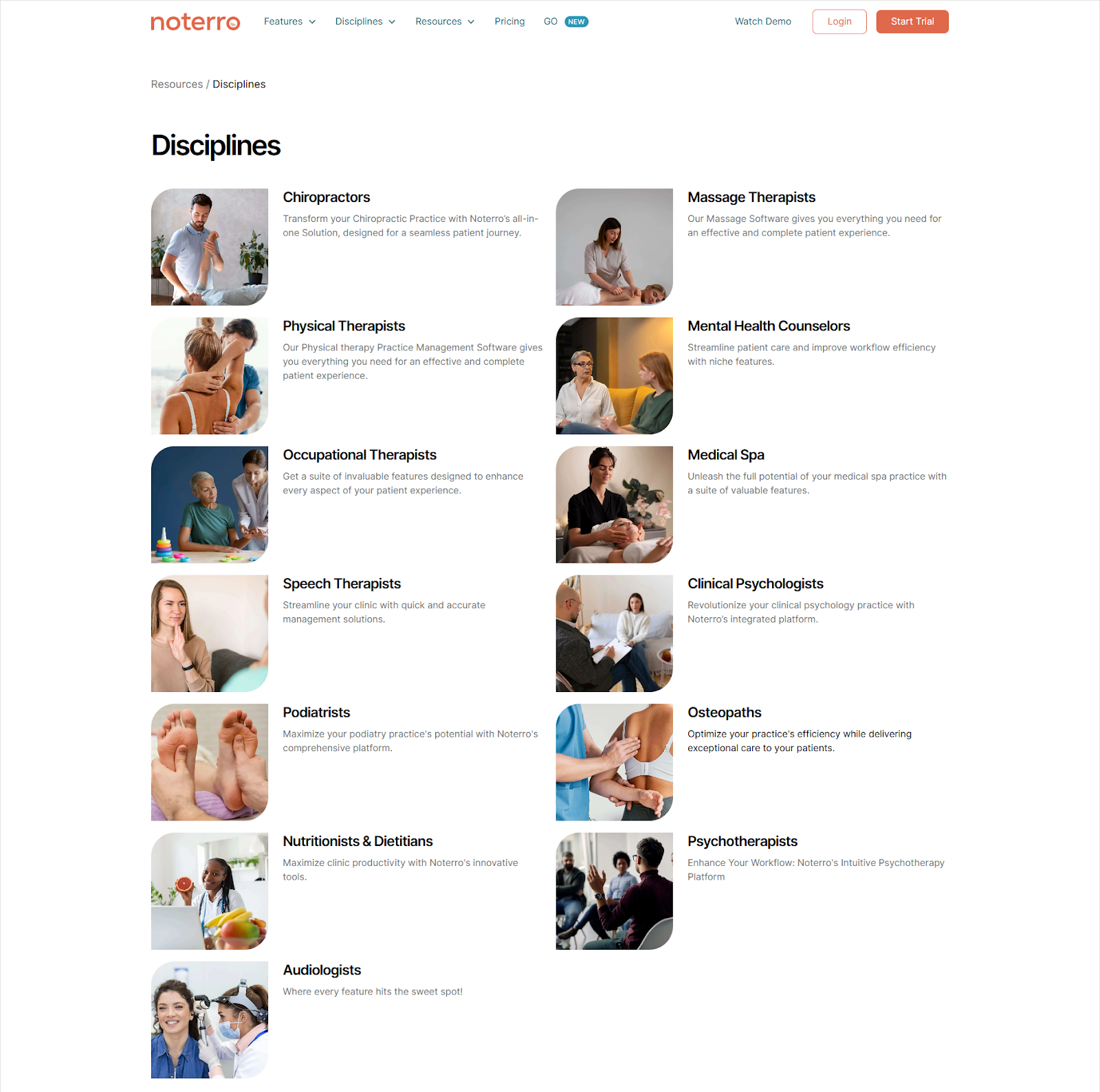We launched landing pages tailored to Noterro’s key disciplines, starting with pages like the one built for chiropractic practices. Here’s an example.
